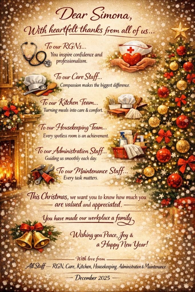 As the year draws to a close and the festive season fills our home with warmth and joy, we, the Registered Nurses (RGNs), Quality Assurance Manager, Care Staff, Kitchen Team, Housekeeping Team, Administration, and Maintenance Staff, would like to take this special moment to say thank you from the bottom of our hearts.